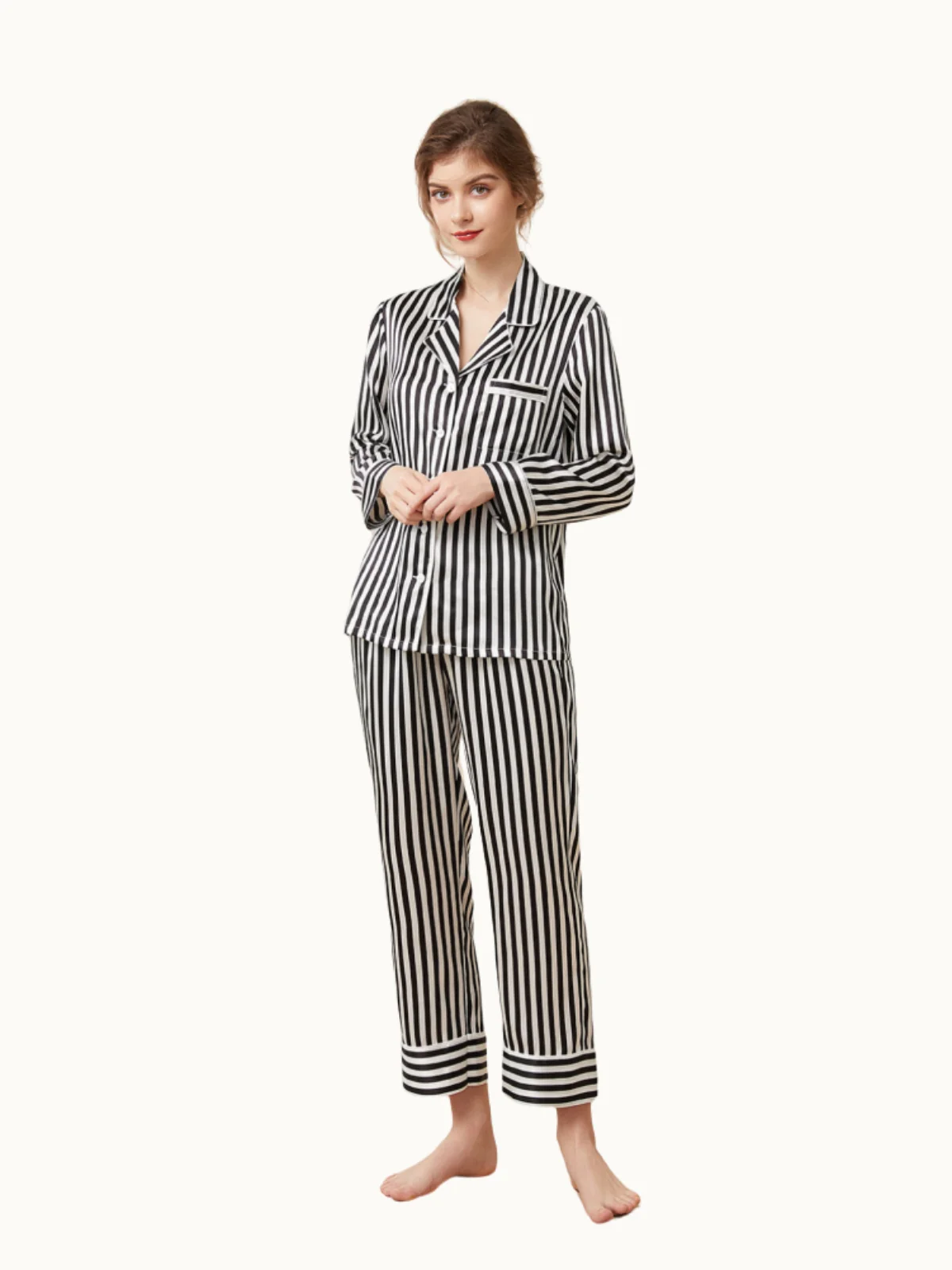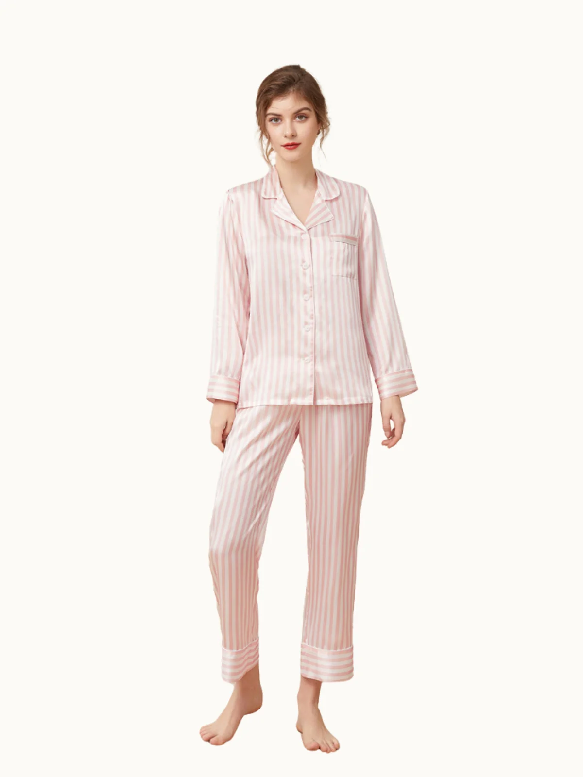 The first glance of this silk pajama set was attracted by its matching. It is rare to find a pink silk pajama set with stripes as an option. You can see all the tiny details on the clothes, and you are the brightest in it even at home, and the washable quality is one of its advantages, very easy to take care of!