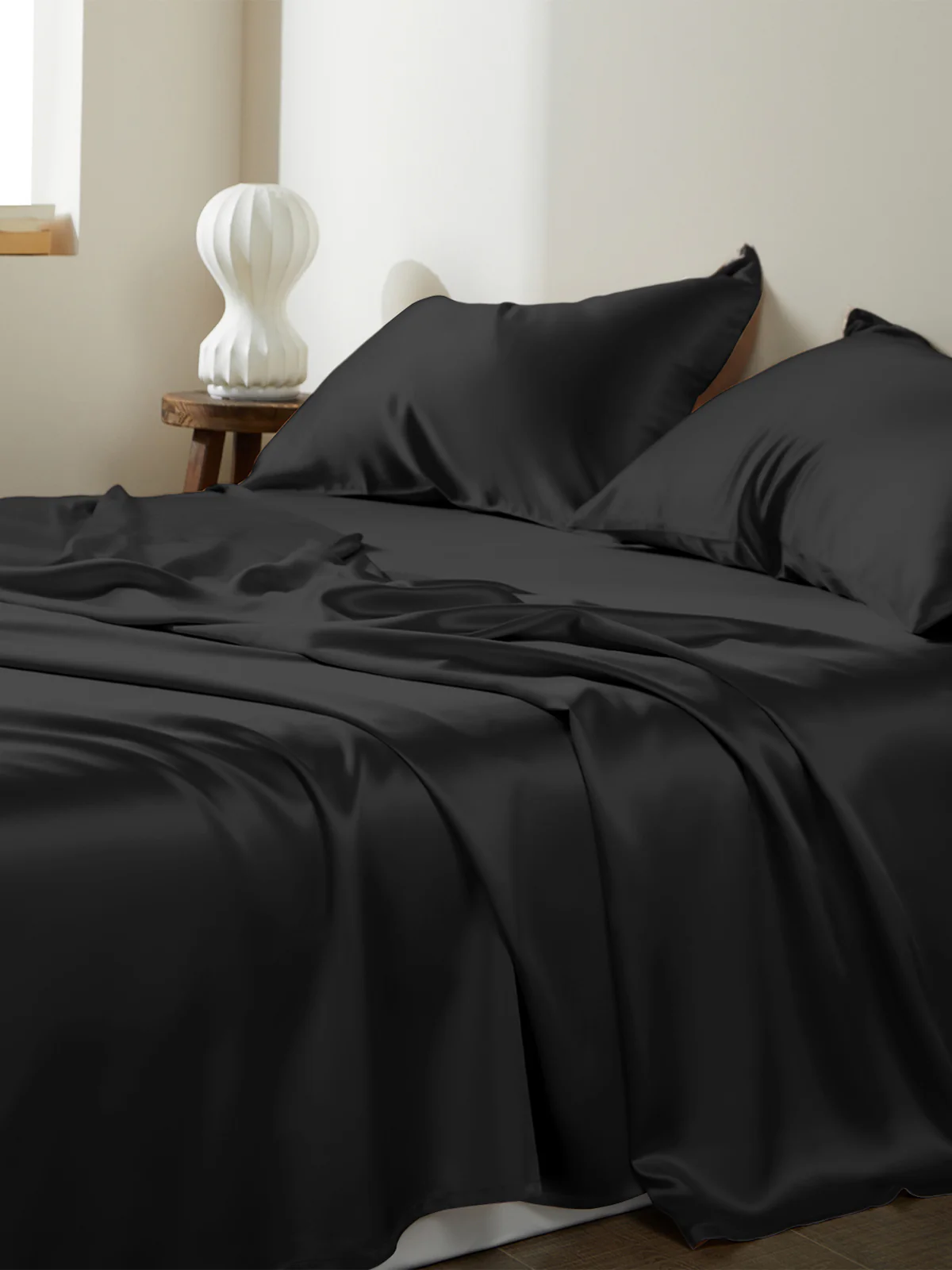 Perfect for year-round use, this luxurious black silk sheet set not only offers unmatched comfort but also adds a timeless, sophisticated touch to your bedroom décor.
