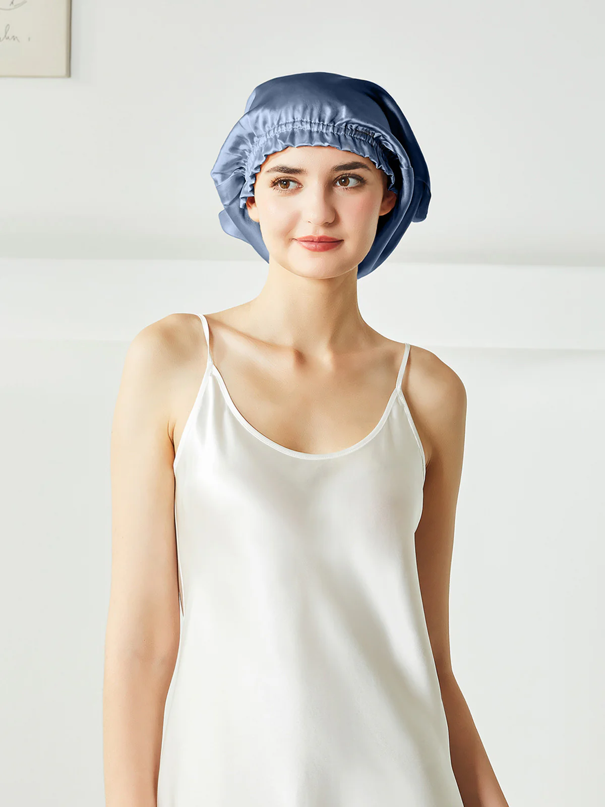 This is a pure silk sleep bonnet. You can be put your hair in the nightcap very relaxedly, instead of being folded on the head like the short nightcap, it can be easily worn on the head before going to bed. Silk can effectively keep the hair properly hydrated, not frizzy, and is beneficial for the hair.