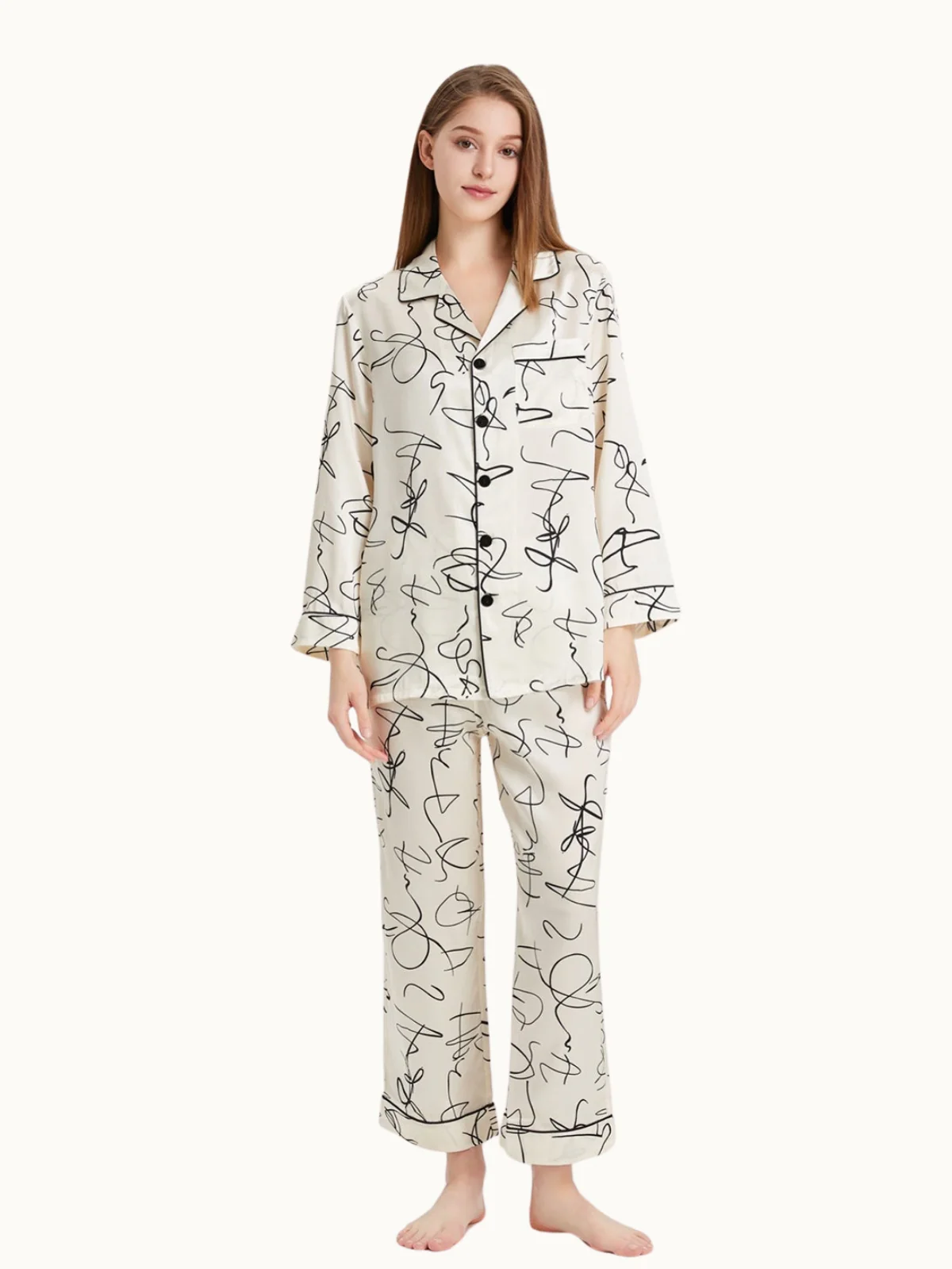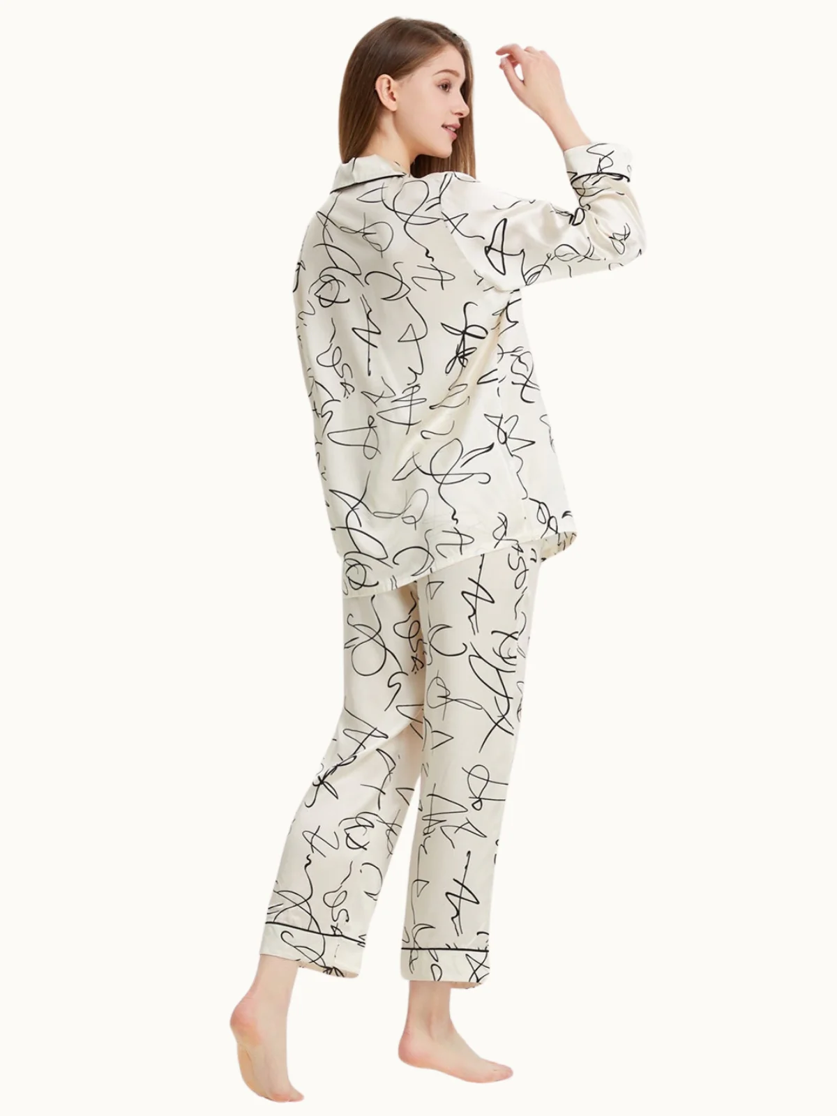 Women Artistic Graffiti Printed Silk Pajamas Set